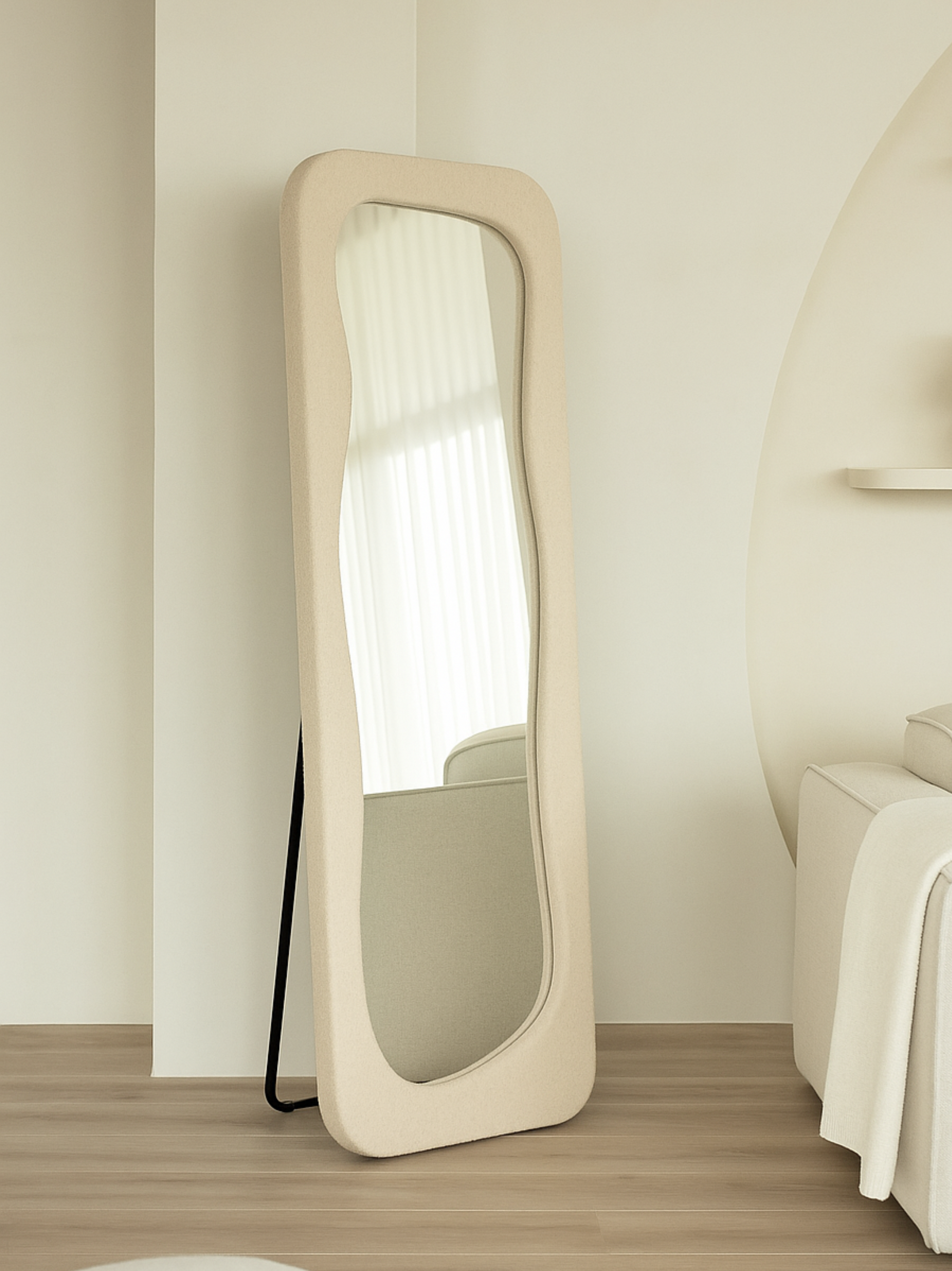 Maak kennis met de SensaHome gestoffeerde staande spiegel Curvy – een moderne, asymmetrische spiegel over de volledige lengte met een organisch glasdesign en een rechthoekige buitenrand. Deze artistieke spiegel, bekleed met teddystof, geeft elke kamer een unieke en eigentijdse touch.