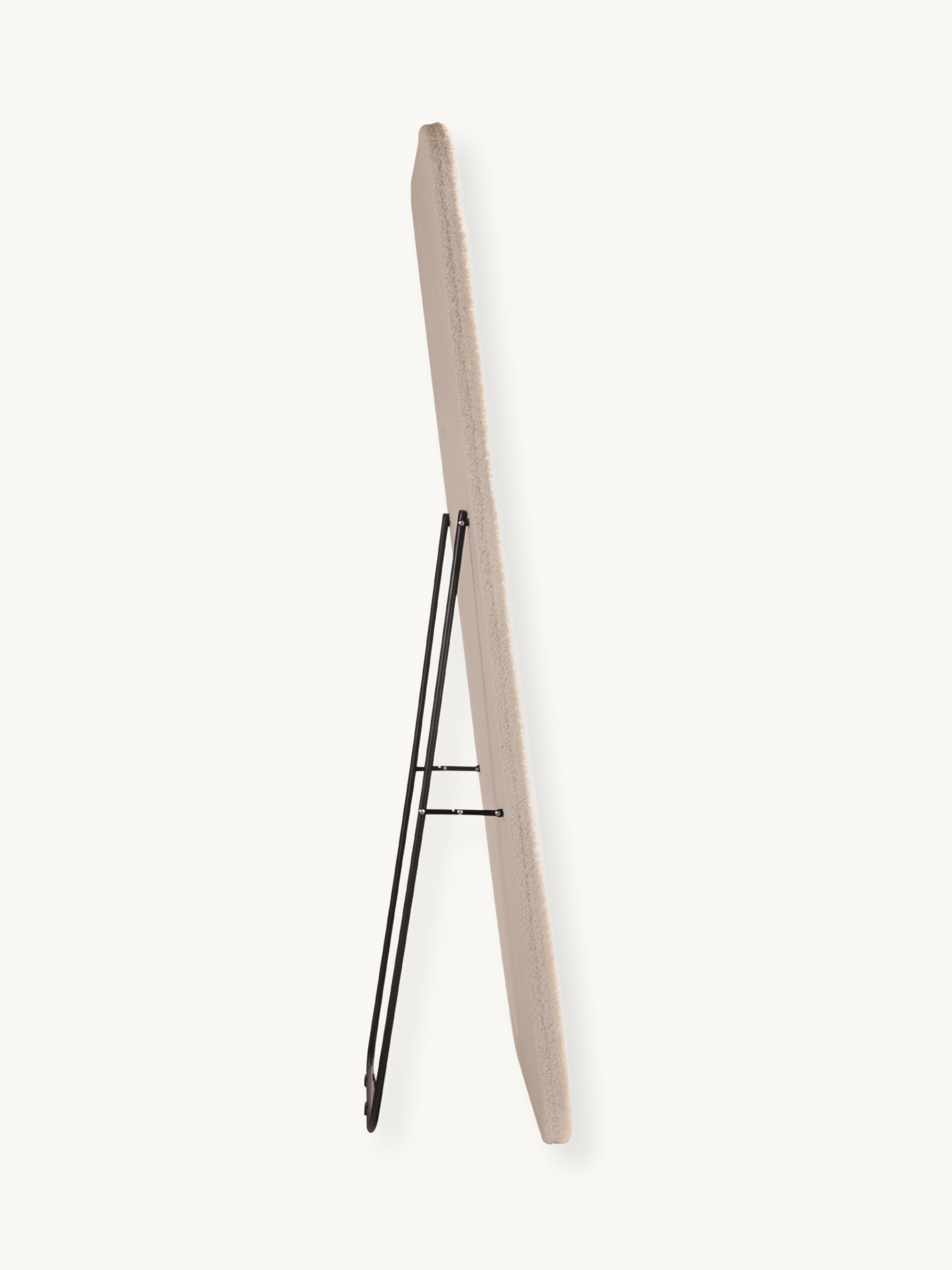 De lijst van de spiegel is bekleed met zachte teddystof, wat een vleugje luxe en gezelligheid toevoegt, terwijl het tegelijkertijd duurzaamheid en een verfijnde uitstraling garandeert.