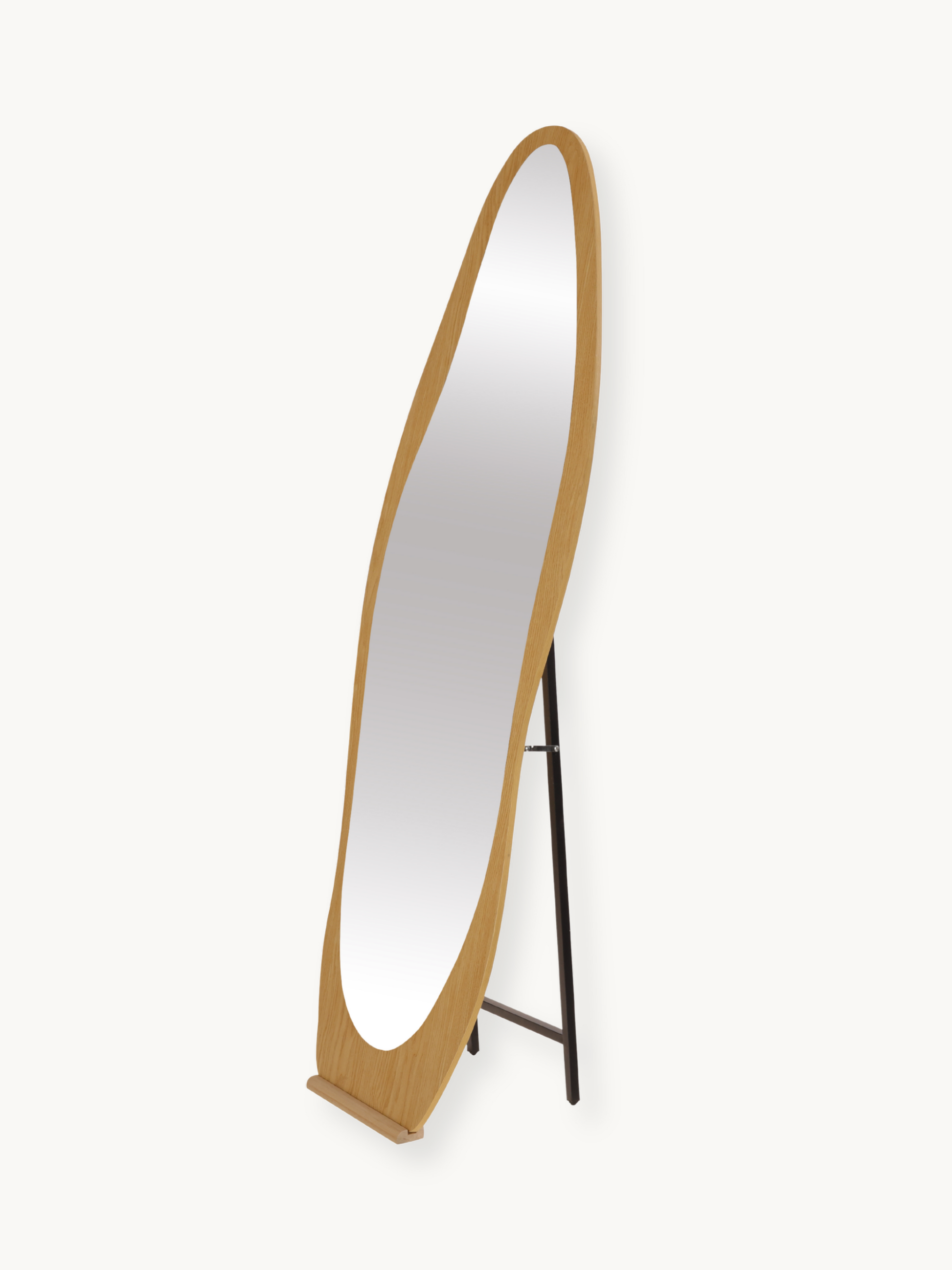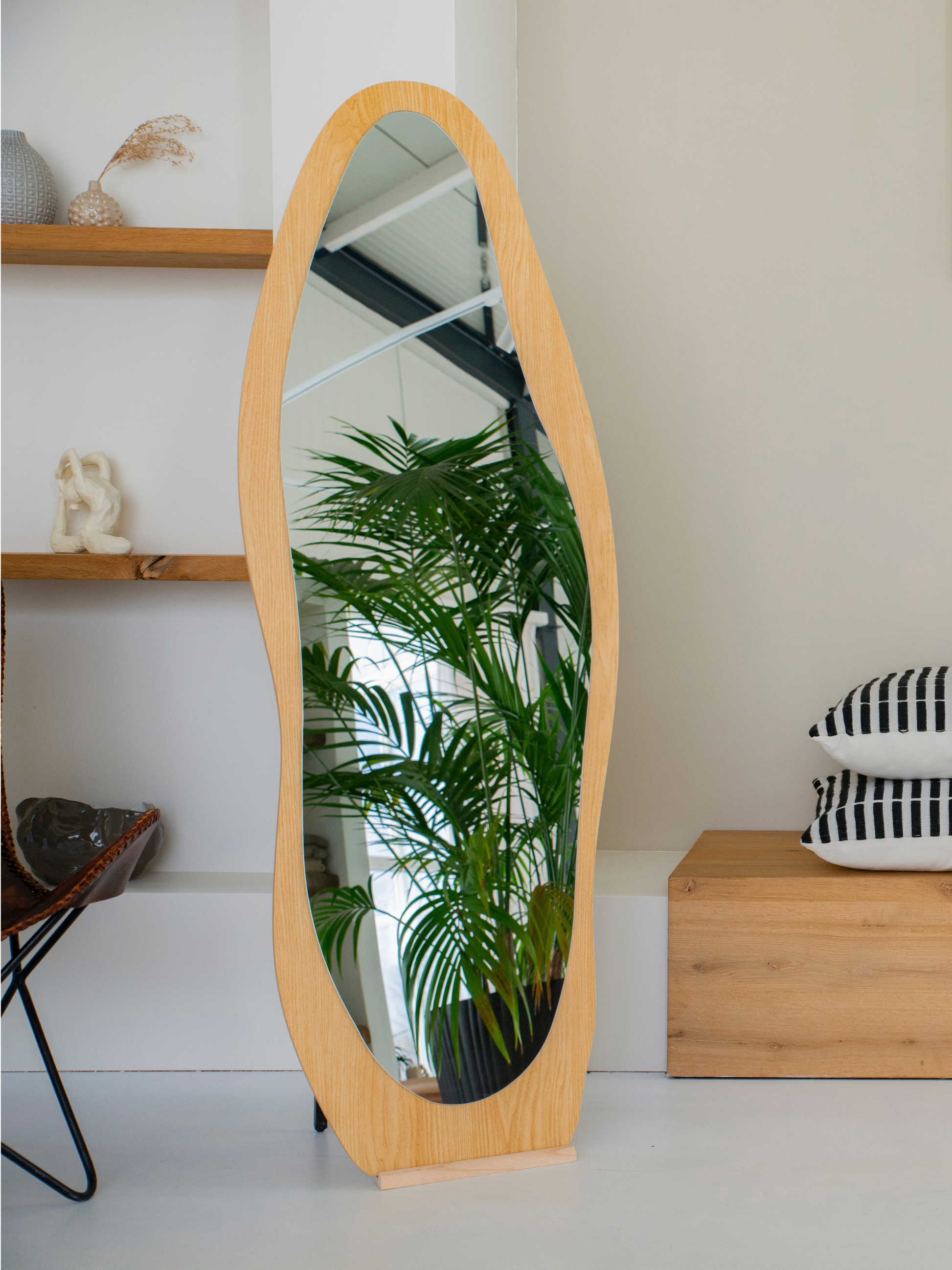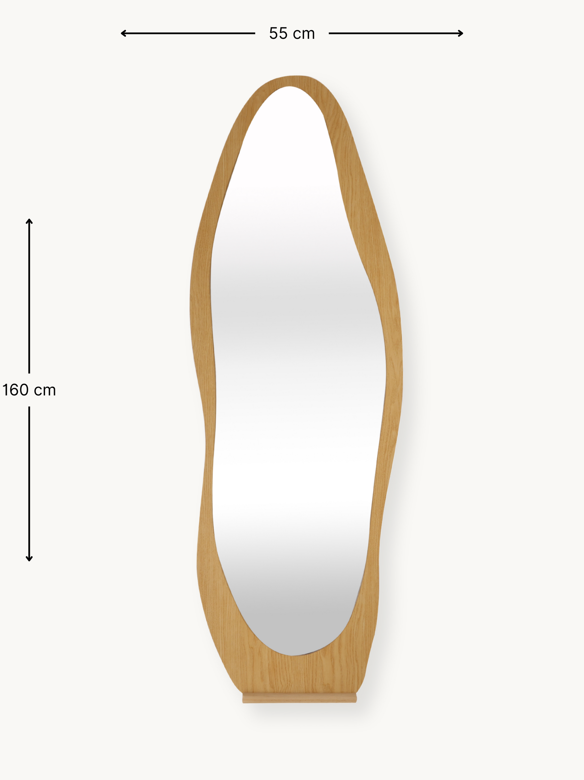 De asymmetrische vorm geeft deze staande spiegel een speelse en eigentijdse uitstraling. De houten lijst met een natuurlijke afwerking brengt warmte en rustieke charme in uw interieur, waardoor hij ideaal is voor woonkamers, slaapkamers of gangen.
