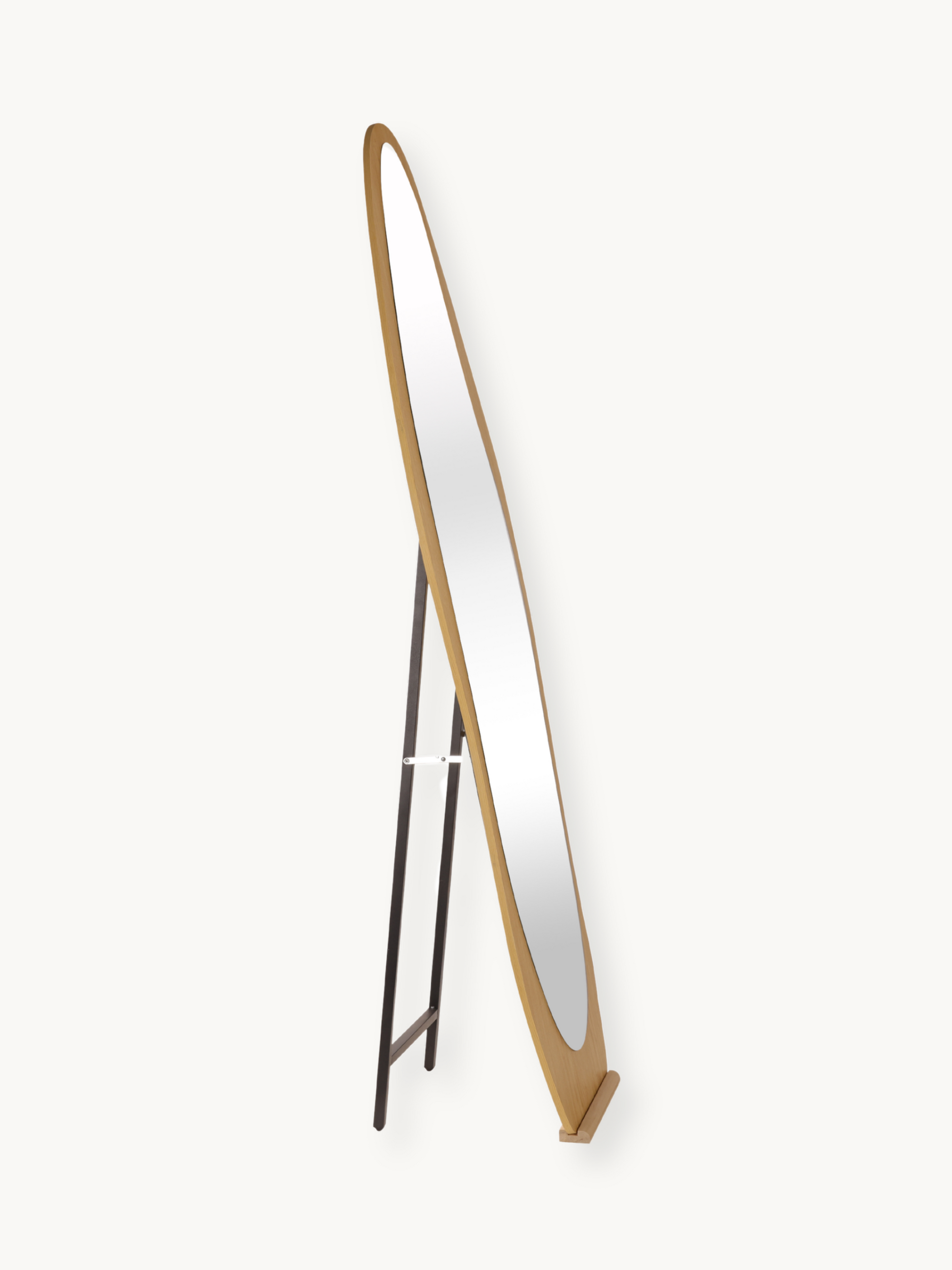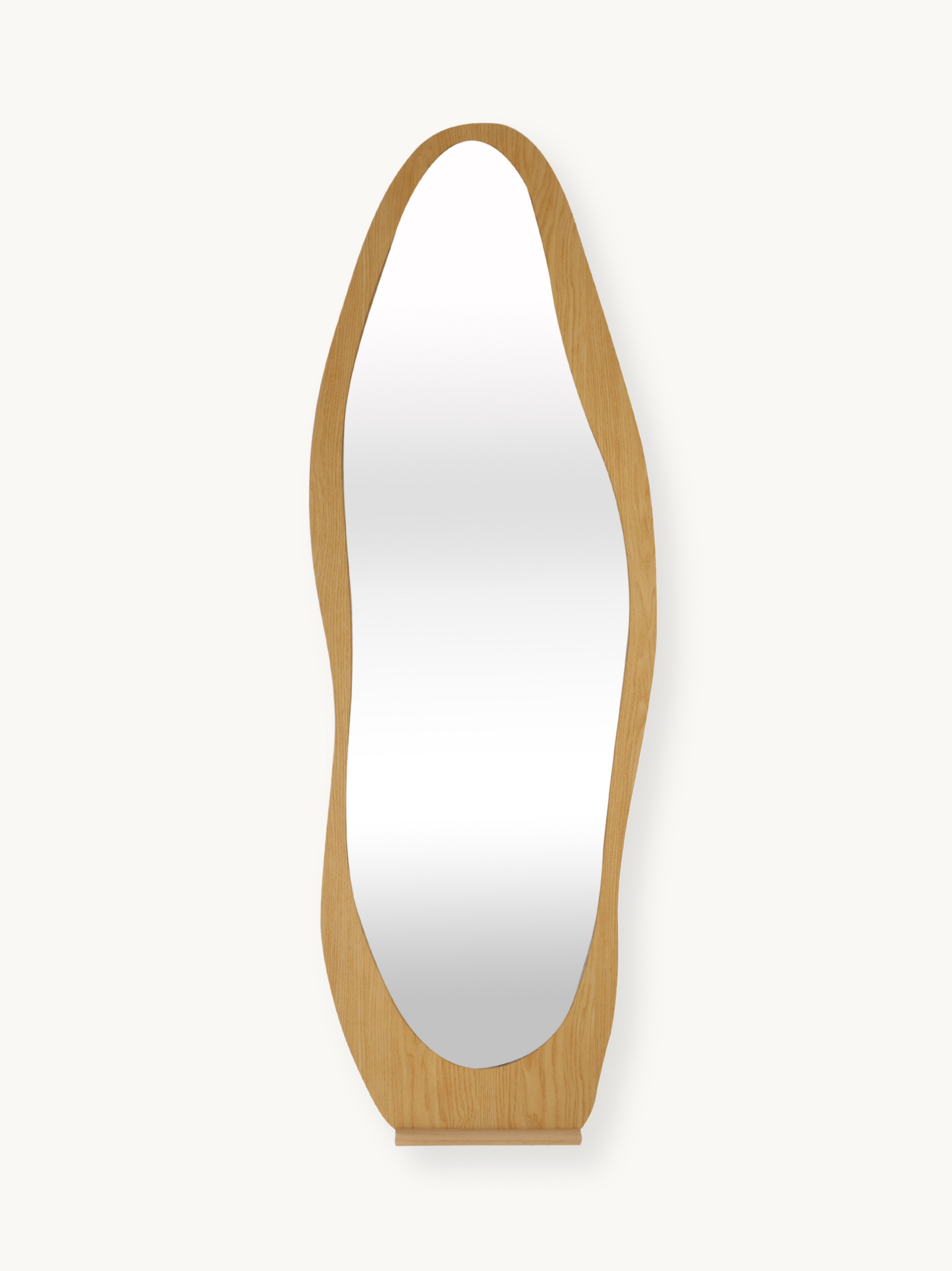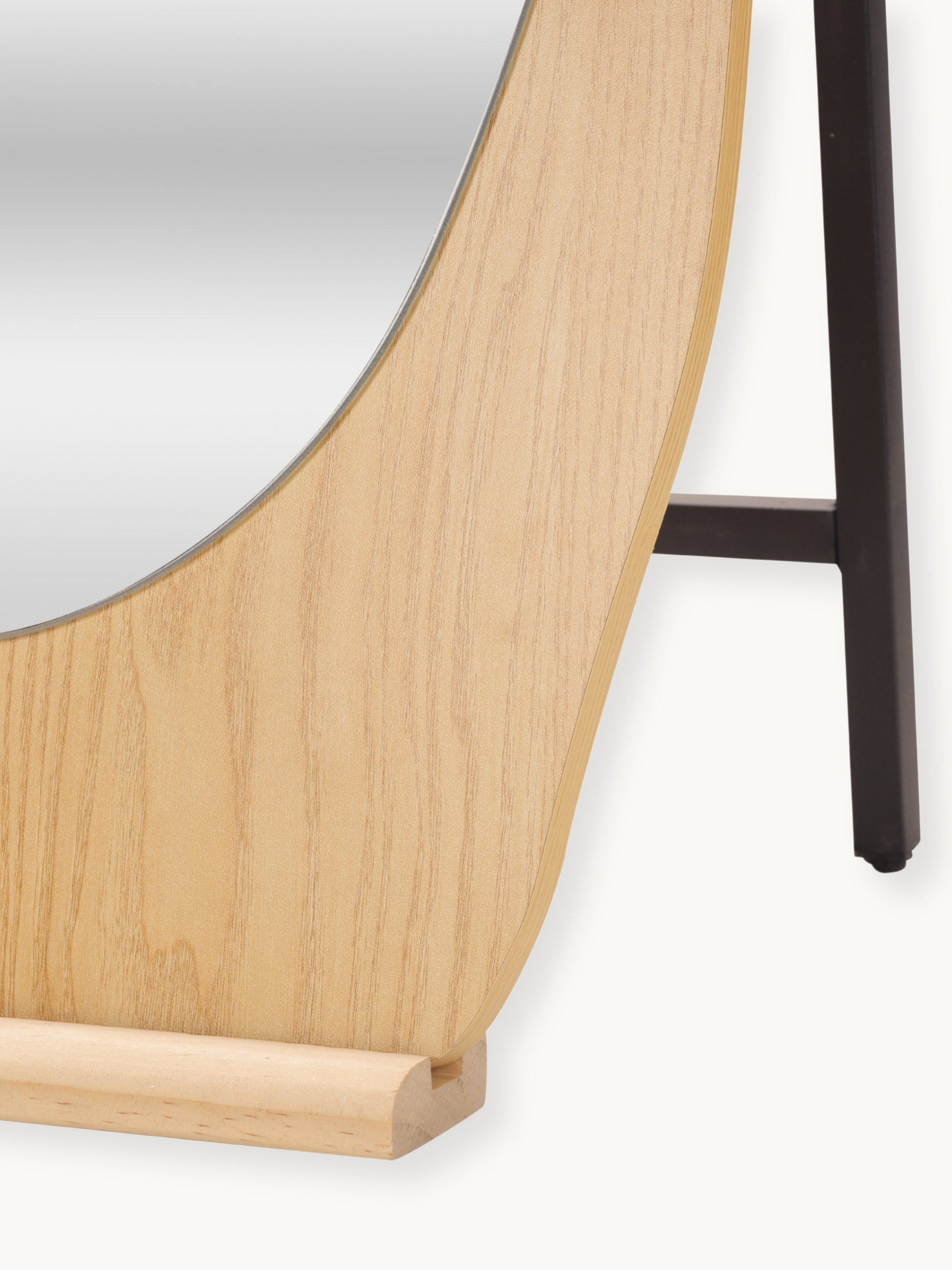 De asymmetrische vorm geeft deze staande spiegel een speelse en eigentijdse uitstraling. De houten lijst met een natuurlijke afwerking brengt warmte en rustieke charme in uw interieur, waardoor hij ideaal is voor woonkamers, slaapkamers of gangen.