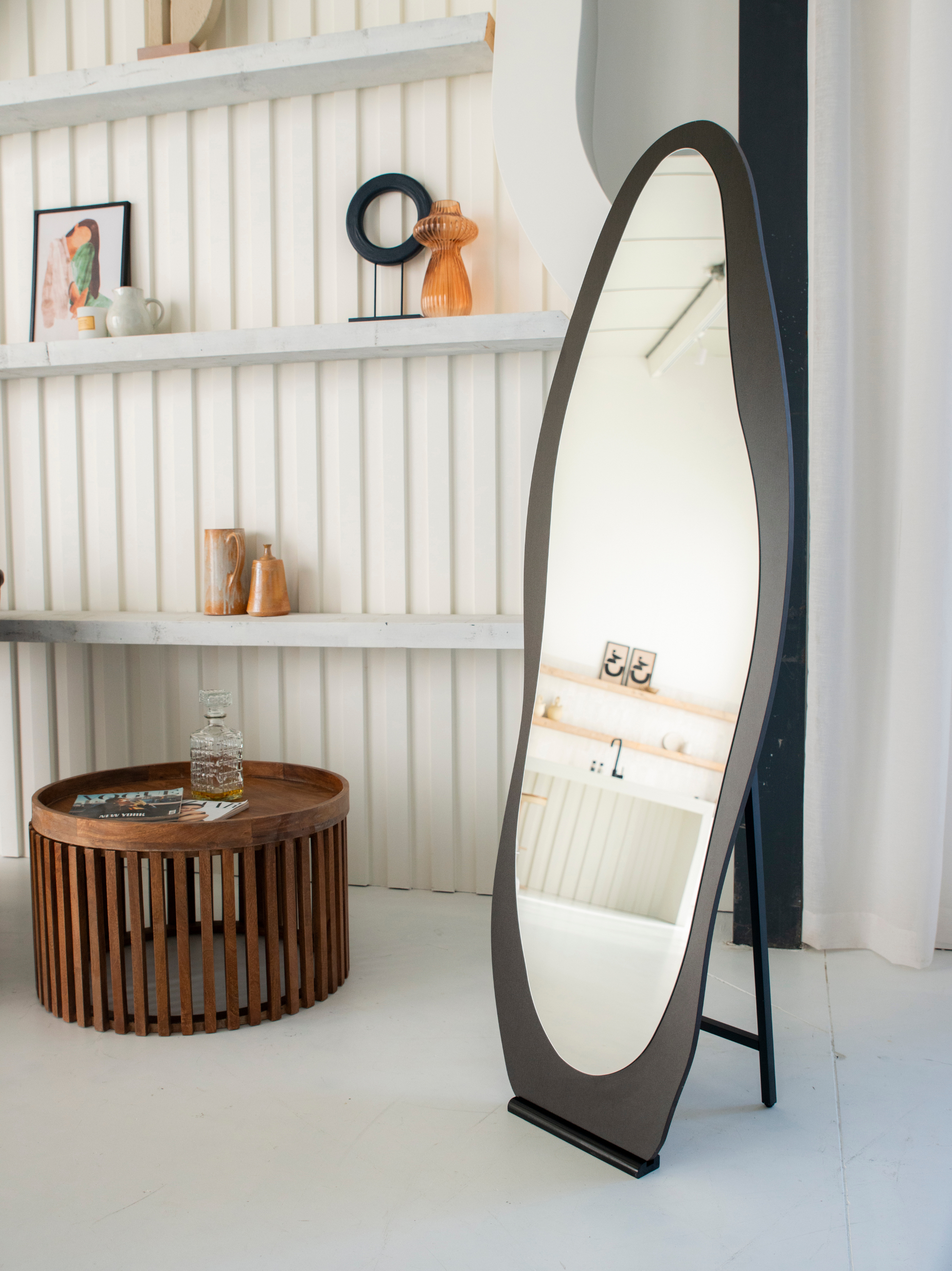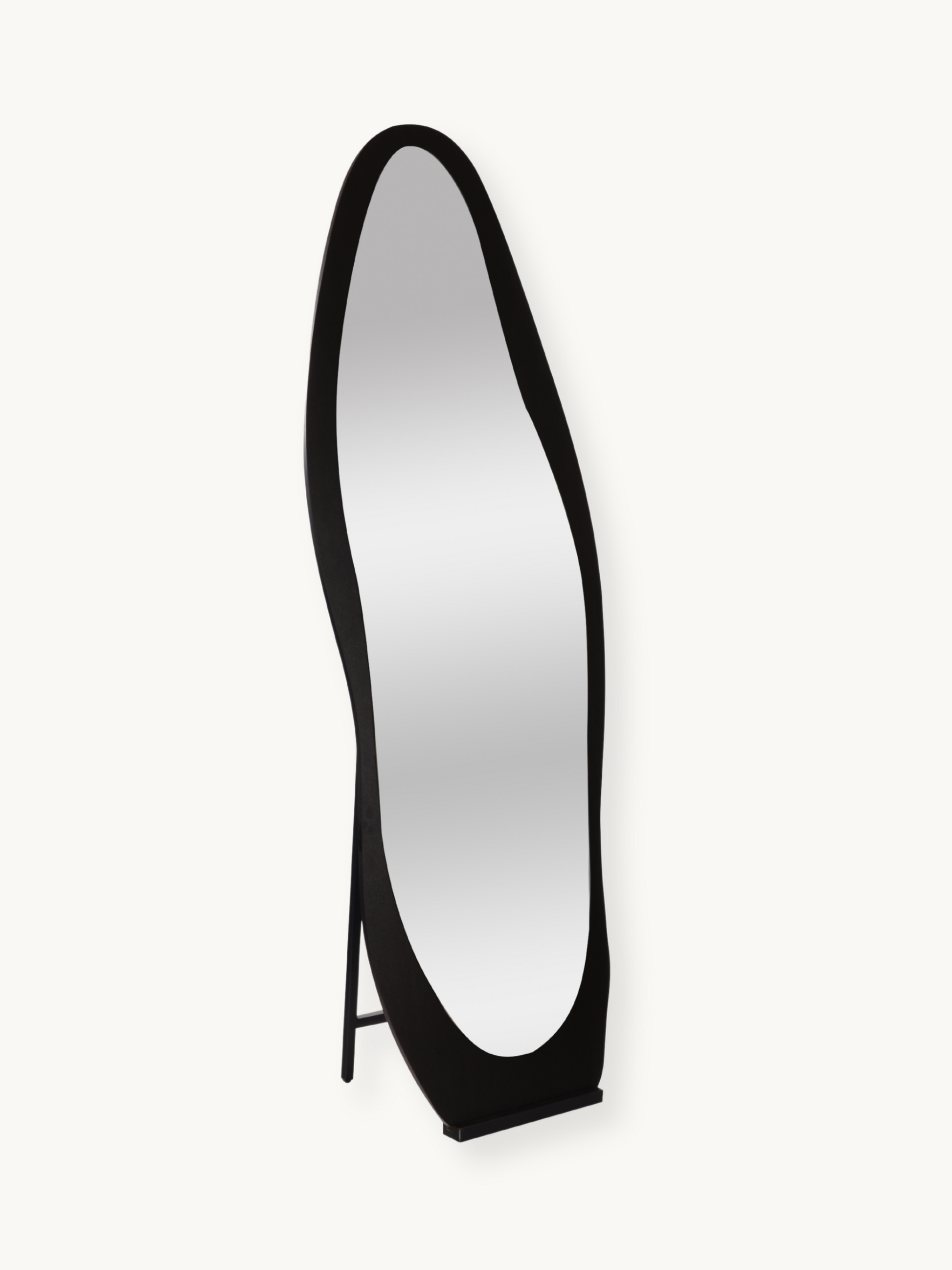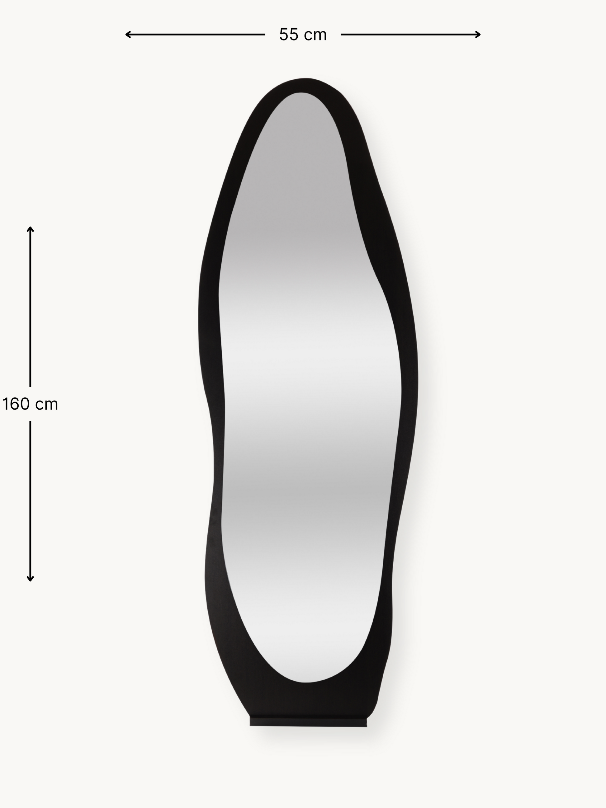 De asymmetrische vorm geeft deze staande spiegel een eigentijdse uitstraling. De minimalistische houten lijst met een strakke zwarte afwerking voegt een luxe en moderne touch toe, perfect voor woonkamers, slaapkamers of gangen.