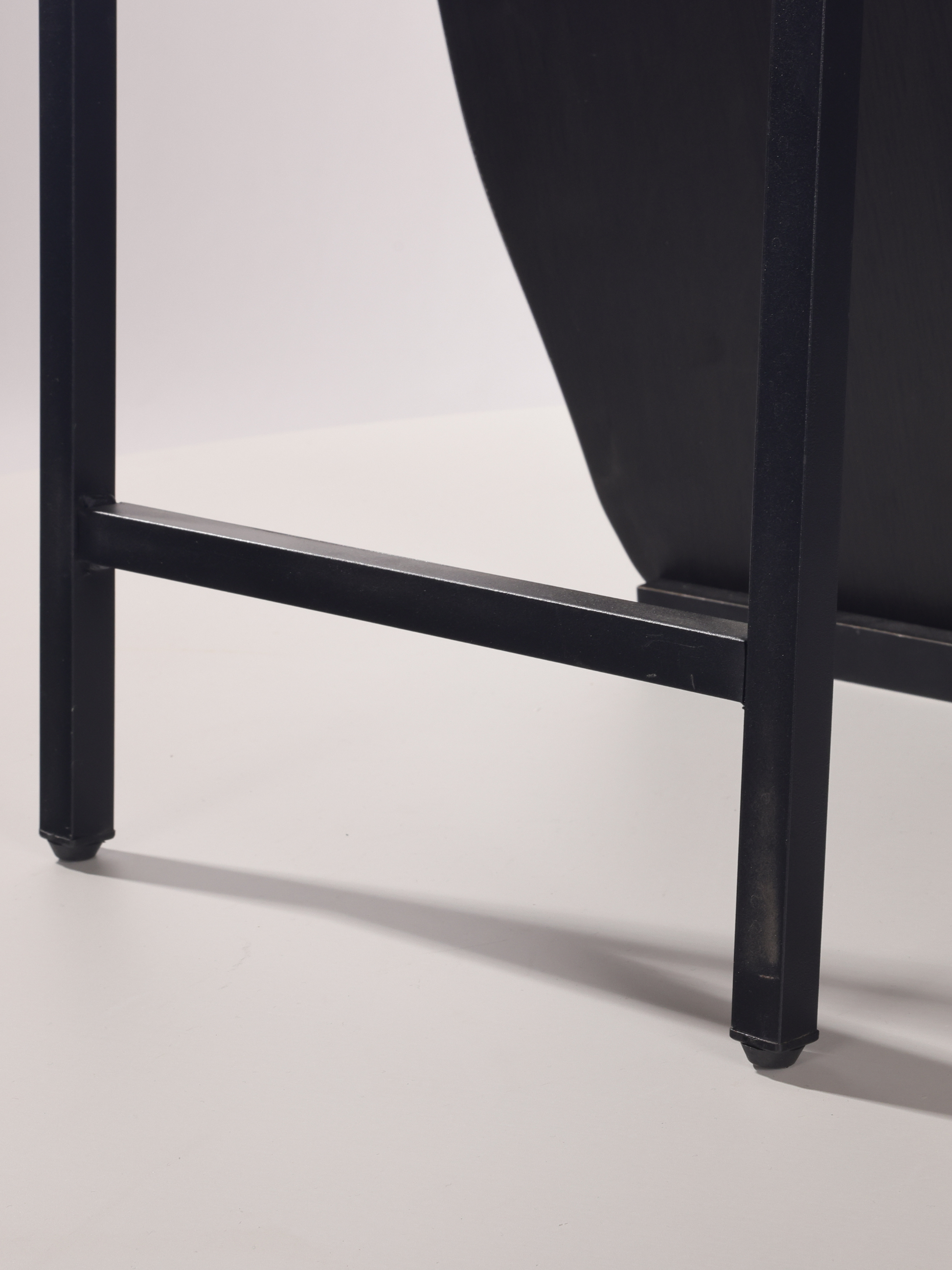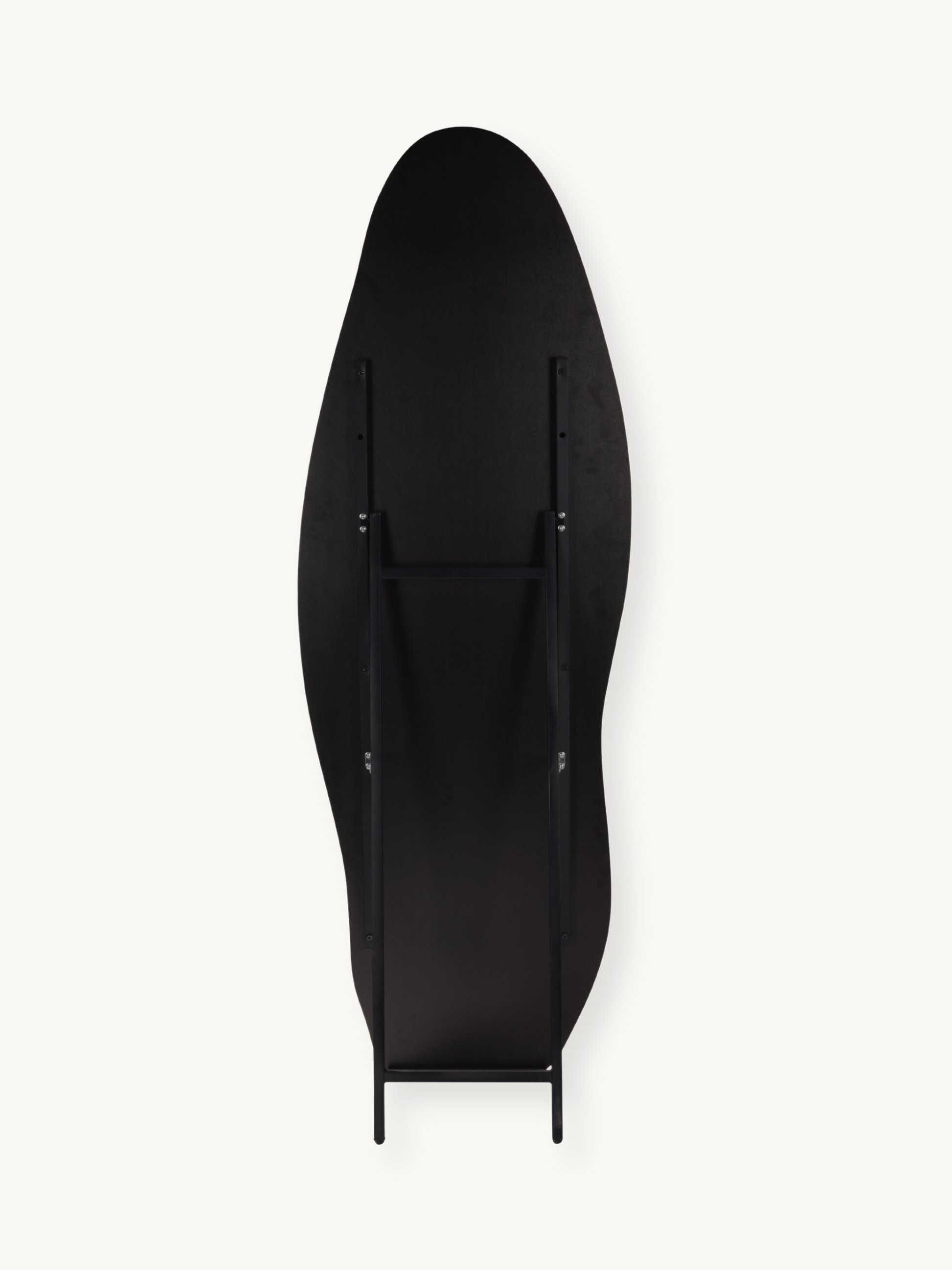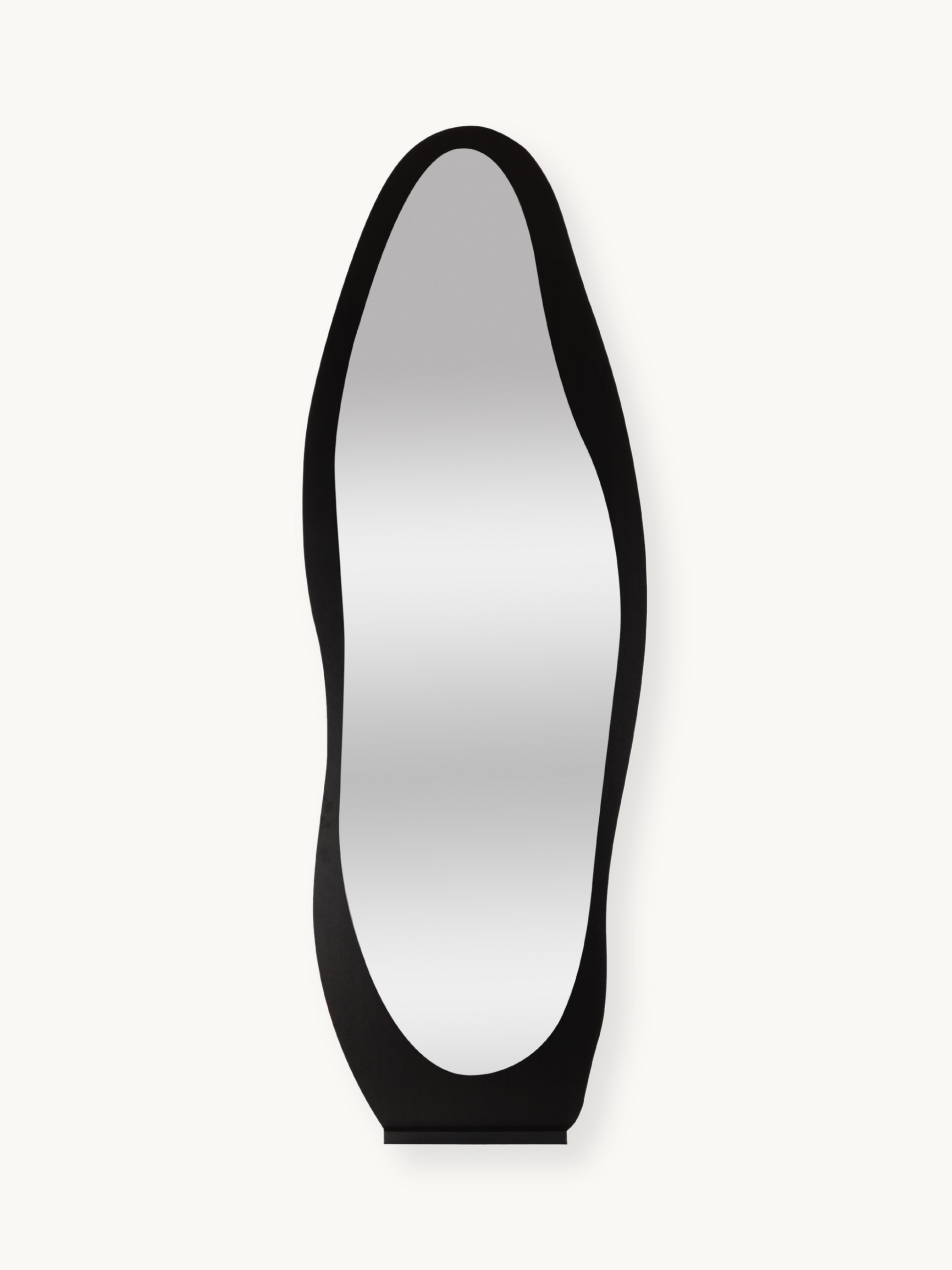 De asymmetrische vorm geeft deze staande spiegel een eigentijdse uitstraling. De minimalistische houten lijst met een strakke zwarte afwerking voegt een luxe en moderne touch toe, perfect voor woonkamers, slaapkamers of gangen.