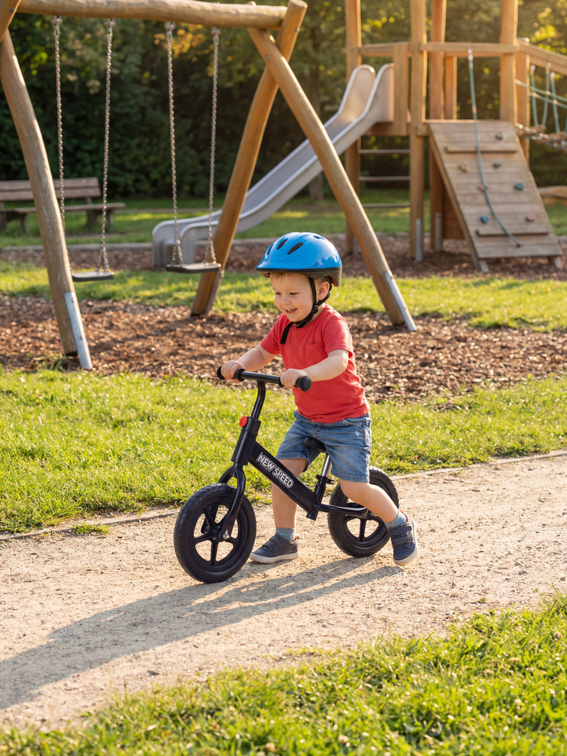 De New Speed loopfiets is gemaakt van duurzame materialen die stabiliteit en een veilige rijervaring garanderen. Het stevige frame van koolstofstaal en de antislip rubberen banden bieden kinderen grip en controle tijdens het rijden.