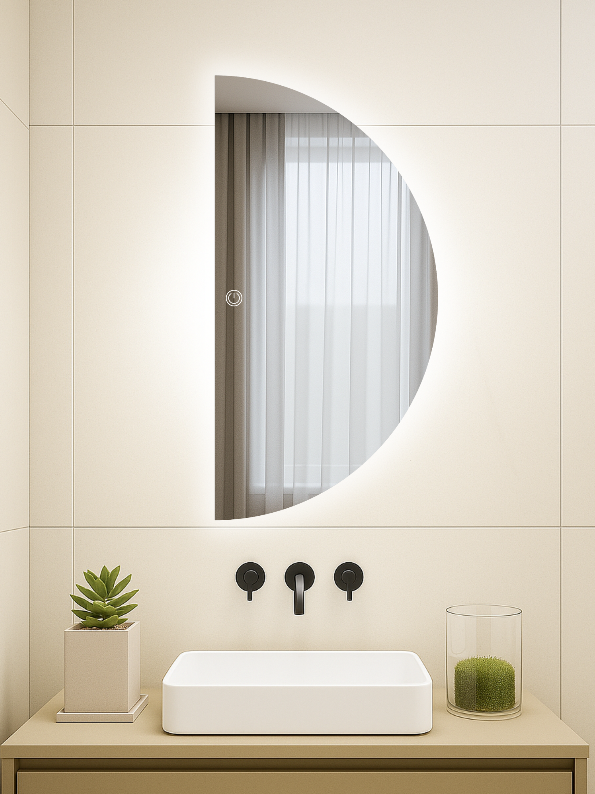 De halfronde vorm en frameloze afwerking geven deze badkamerspiegel een strakke, moderne uitstraling. Dit maakt hem een stijlvolle toevoeging aan zowel klassieke als moderne badkamers.