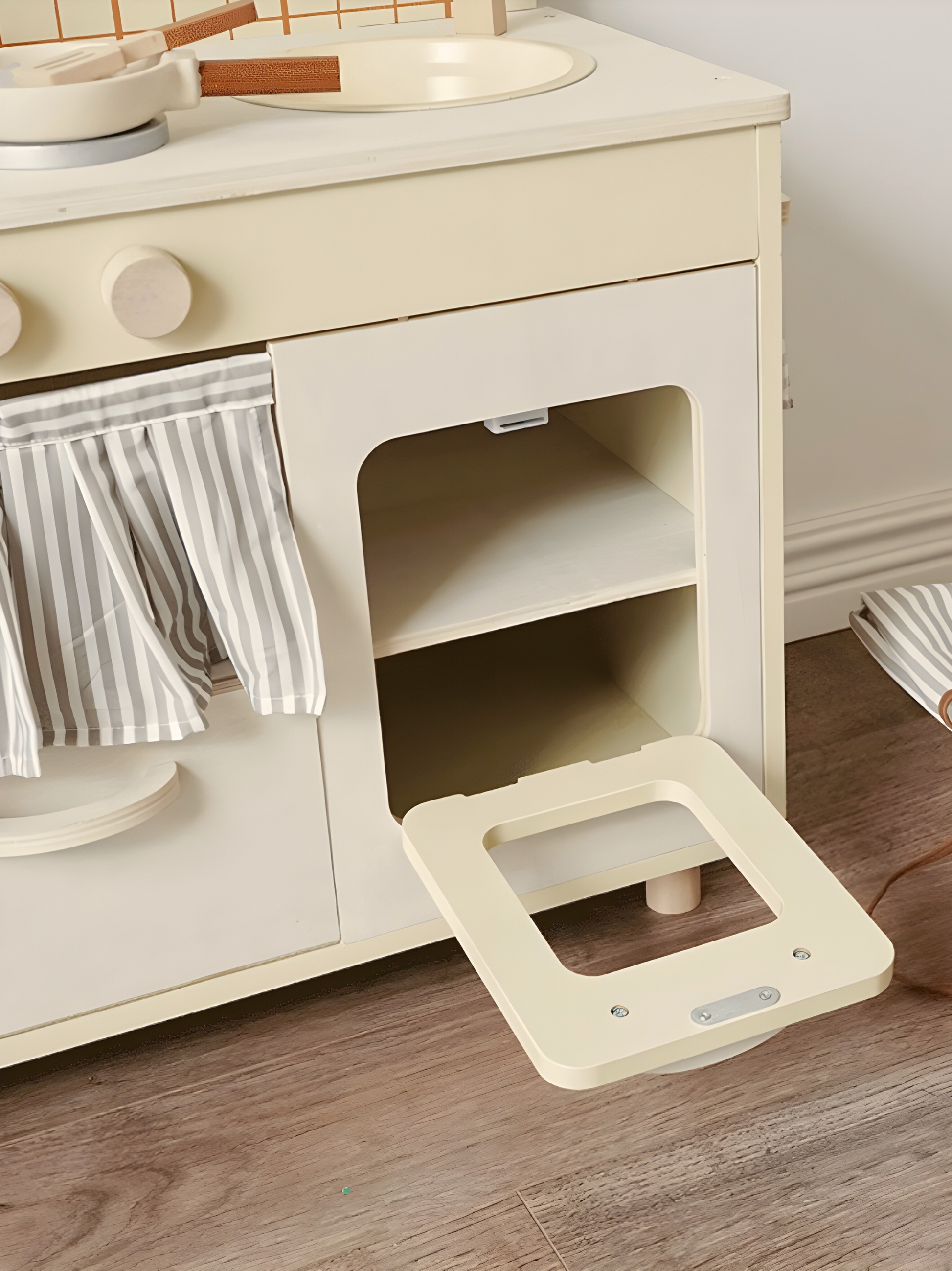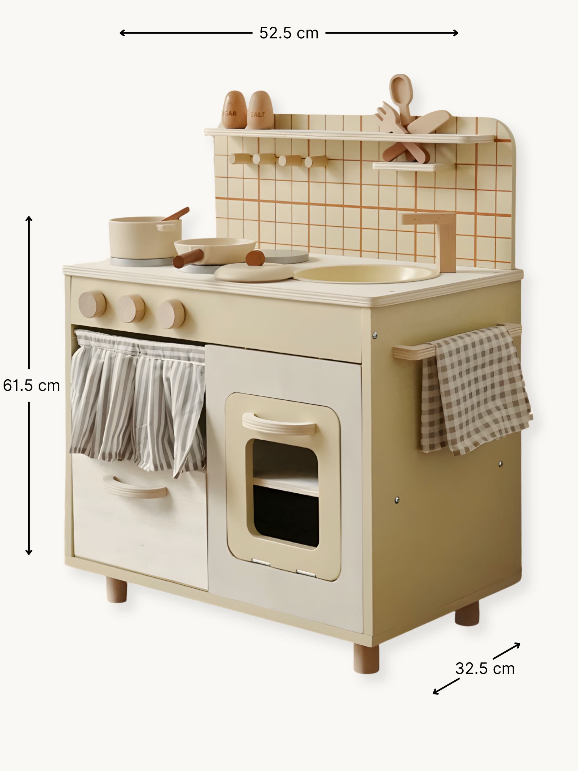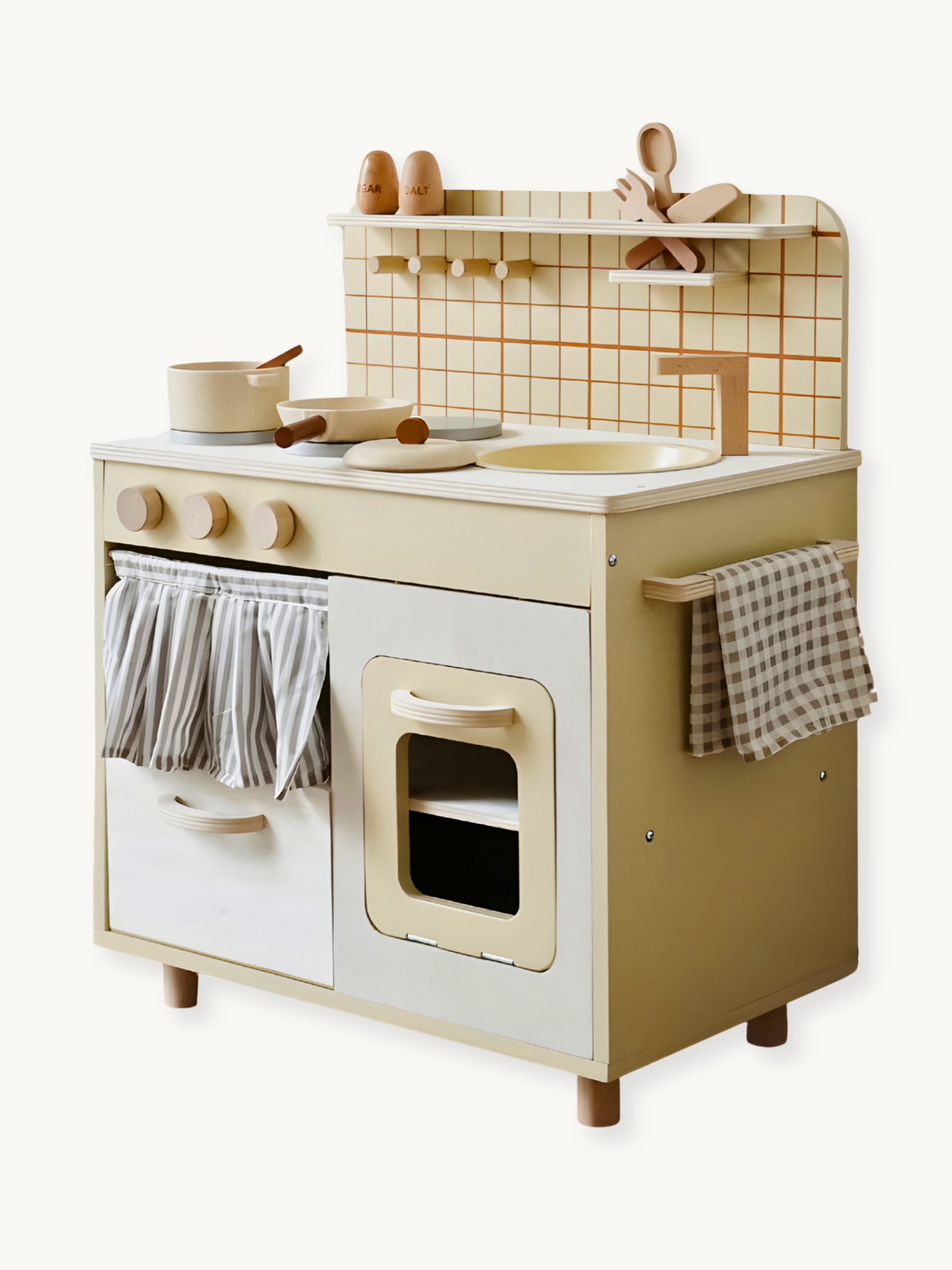 Deze speelkeuken is gemaakt van hoogwaardig hout, wat zorgt voor duurzaamheid en een elegante uitstraling. Het kindvriendelijke ontwerp met afgeronde hoeken en stevige constructie garandeert een veilige speelomgeving voor uw kind.