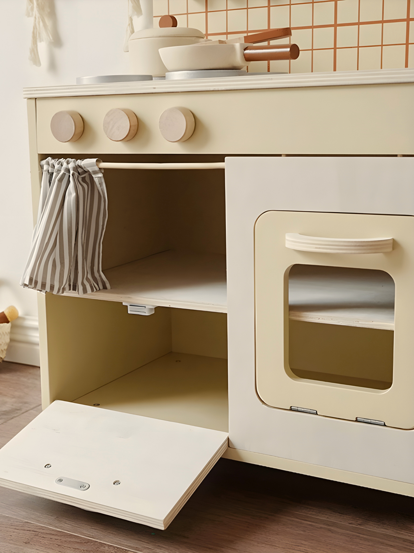 Deze speelkeuken is gemaakt van massief hout en biedt een stabiele en stevige constructie. Het kindvriendelijke ontwerp met afgeronde hoeken zorgt voor een veilige speelomgeving voor uw kind.