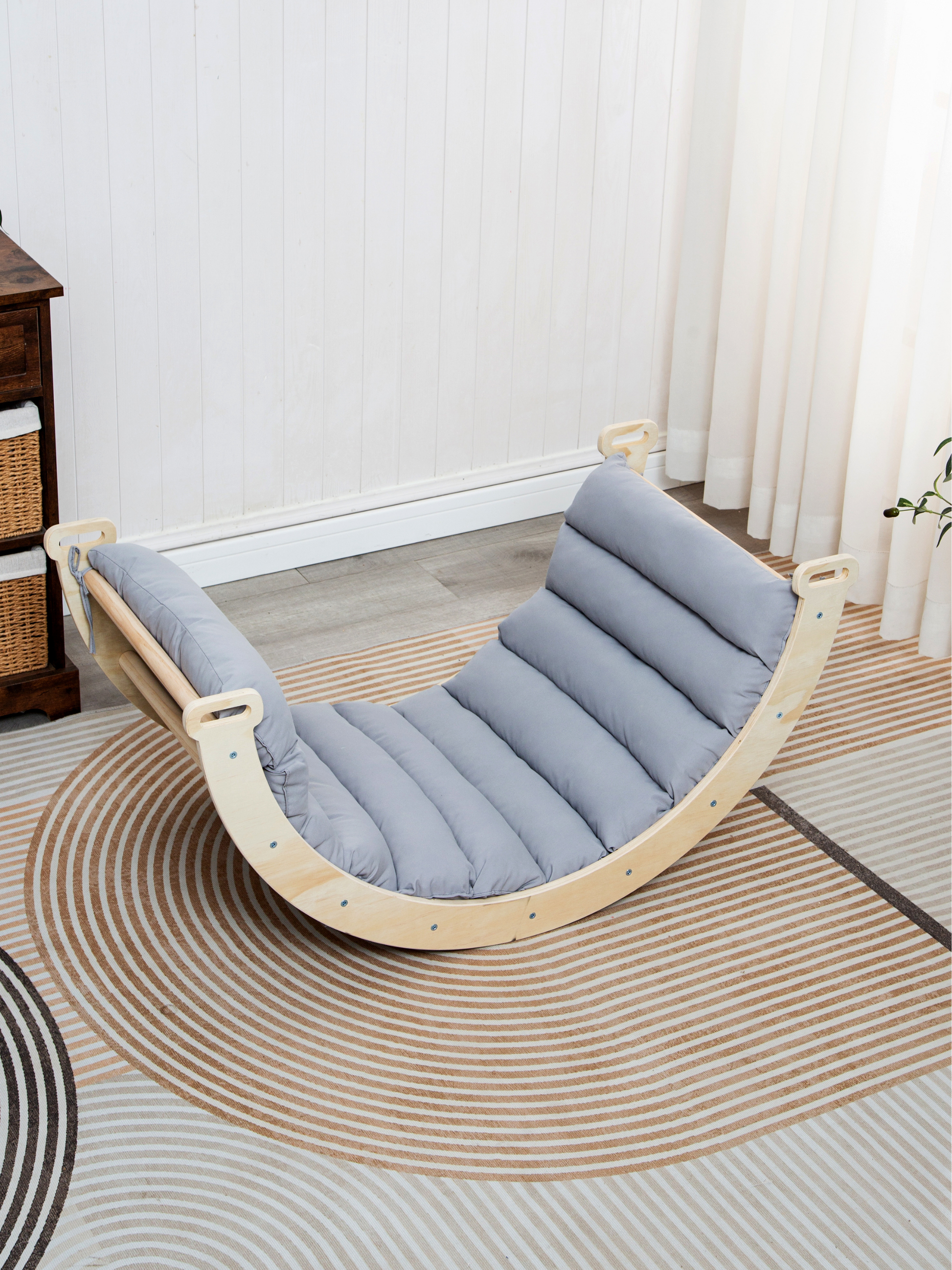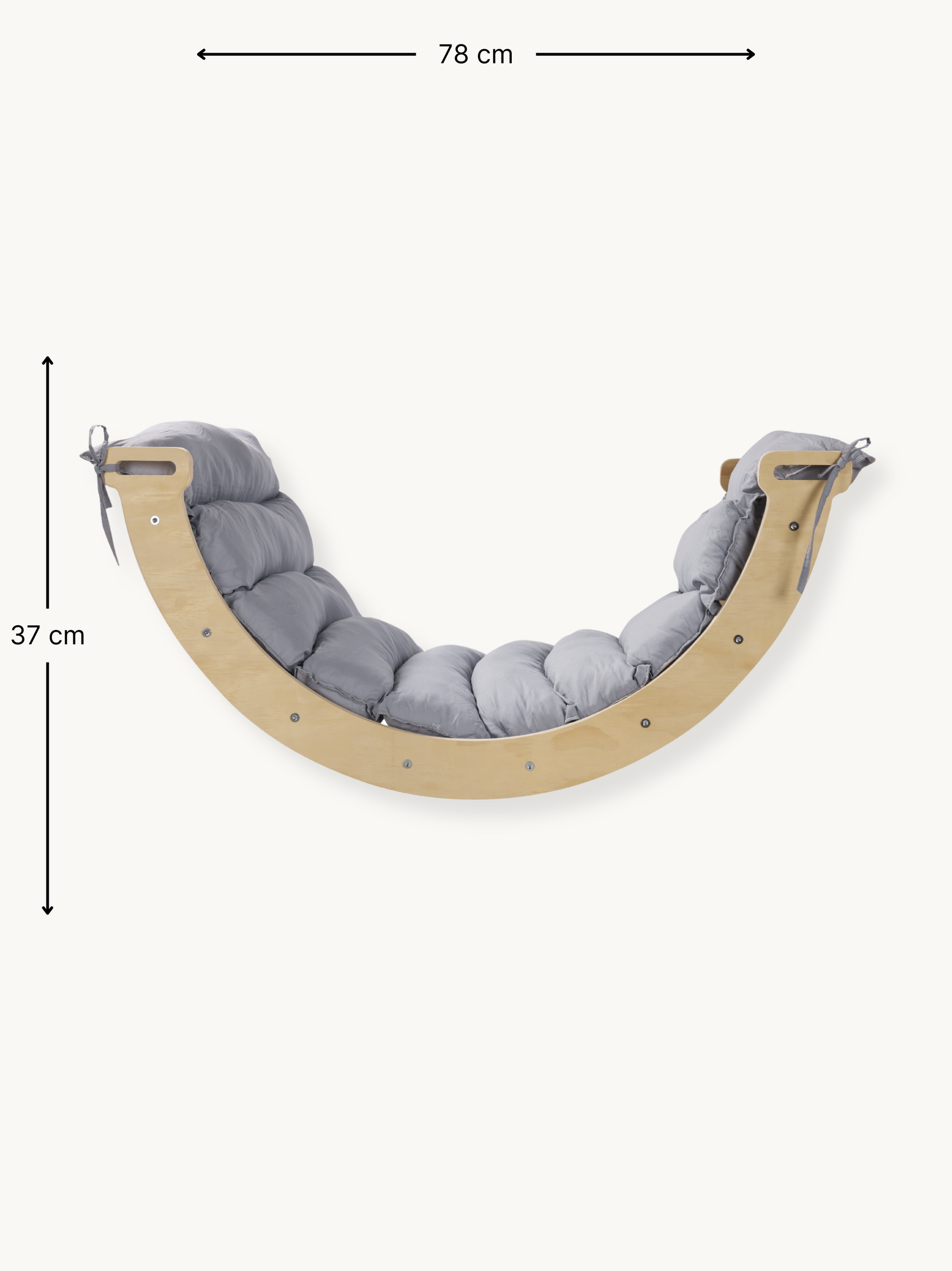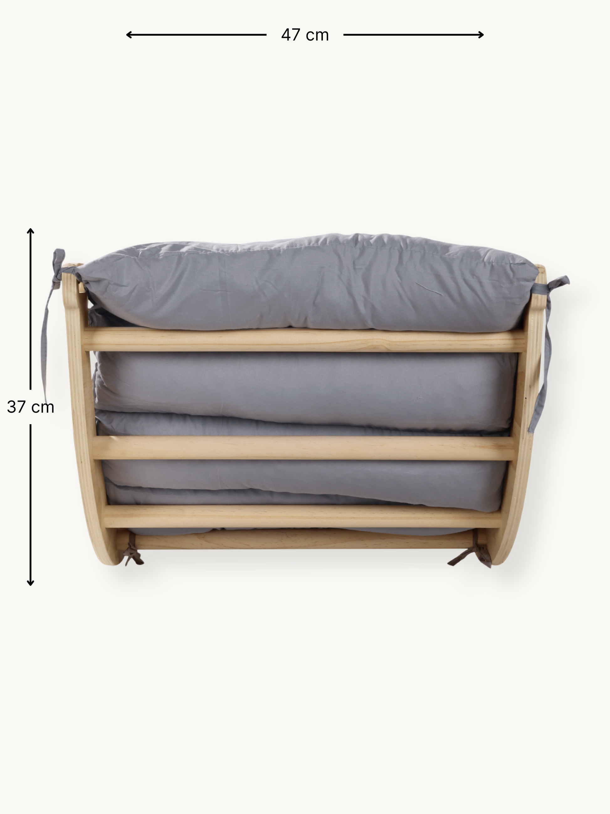 Gemaakt van stevig hout en afgewerkt met een stijlvol grijs kussen voor extra comfort. De afgeronde randen zorgen voor een veilige speelervaring. Het natuurlijke ontwerp past prachtig in elke speelkamer of kinderkamer.