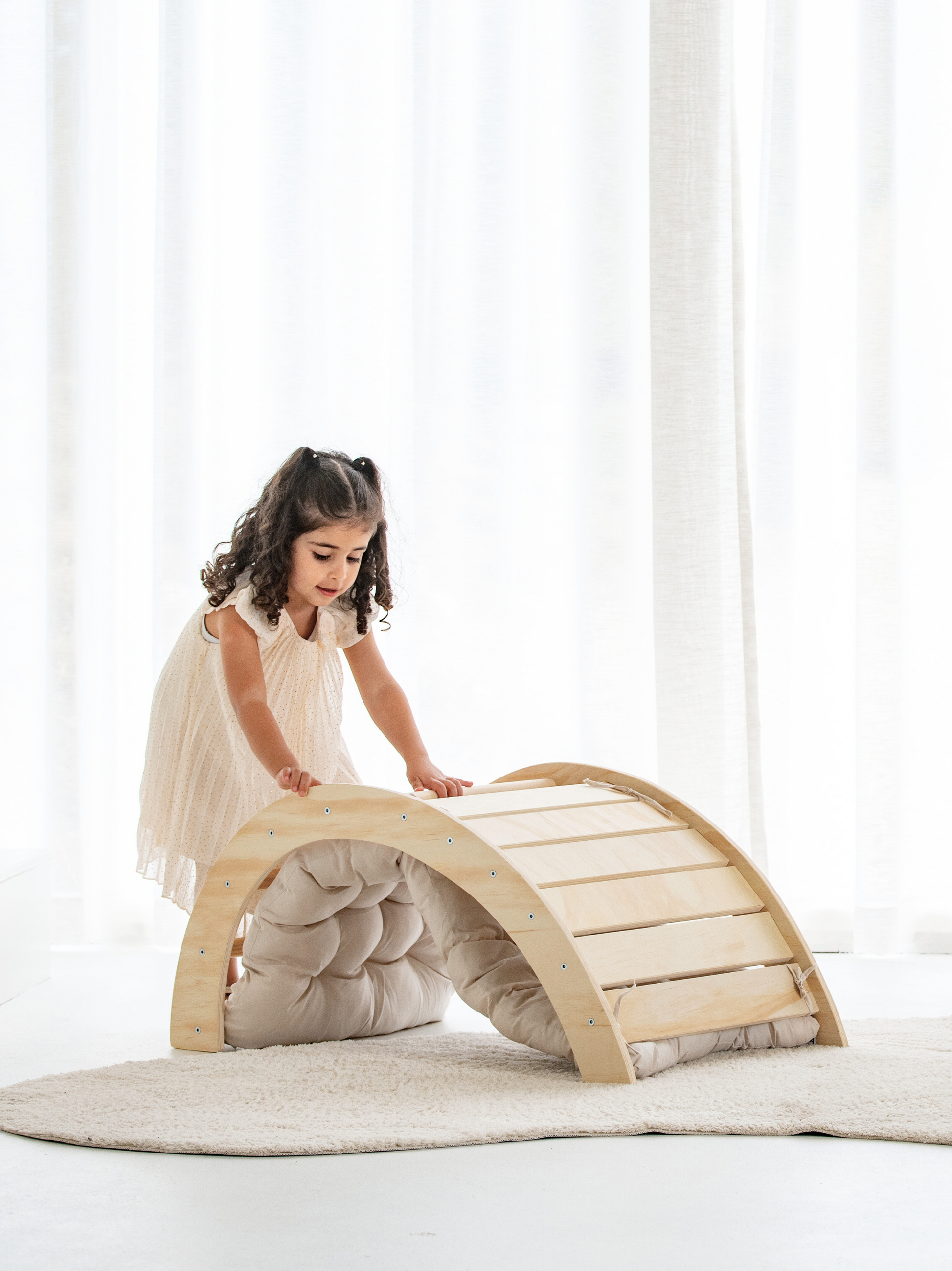 De klimboog is ontworpen volgens de Montessori-principes en ondersteunt zelfstandig en creatief spelen. Het veelzijdige ontwerp biedt ook ruimte om te ontspannen of kan met het meegeleverde kussen als schommel gebruikt worden.