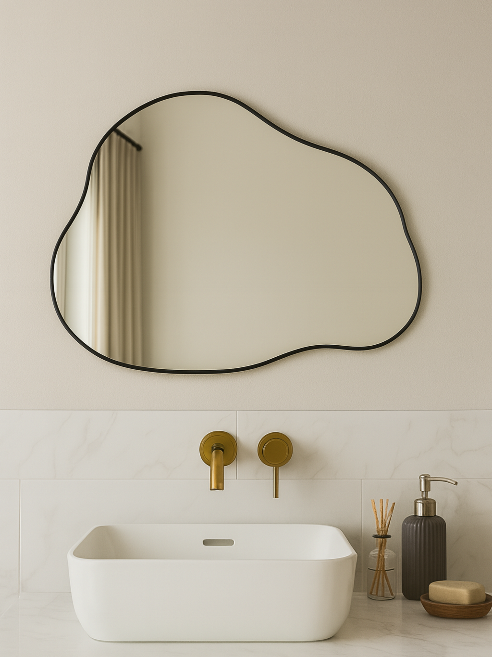 De SensaHome Matteo Wandspiegel is een stijlvolle, asymmetrische spiegel met een organisch ontwerp. Deze spiegel met zwarte afwerking is perfect voor de hal, badkamer of slaapkamer en brengt zowel elegantie als speelsheid in je interieur.