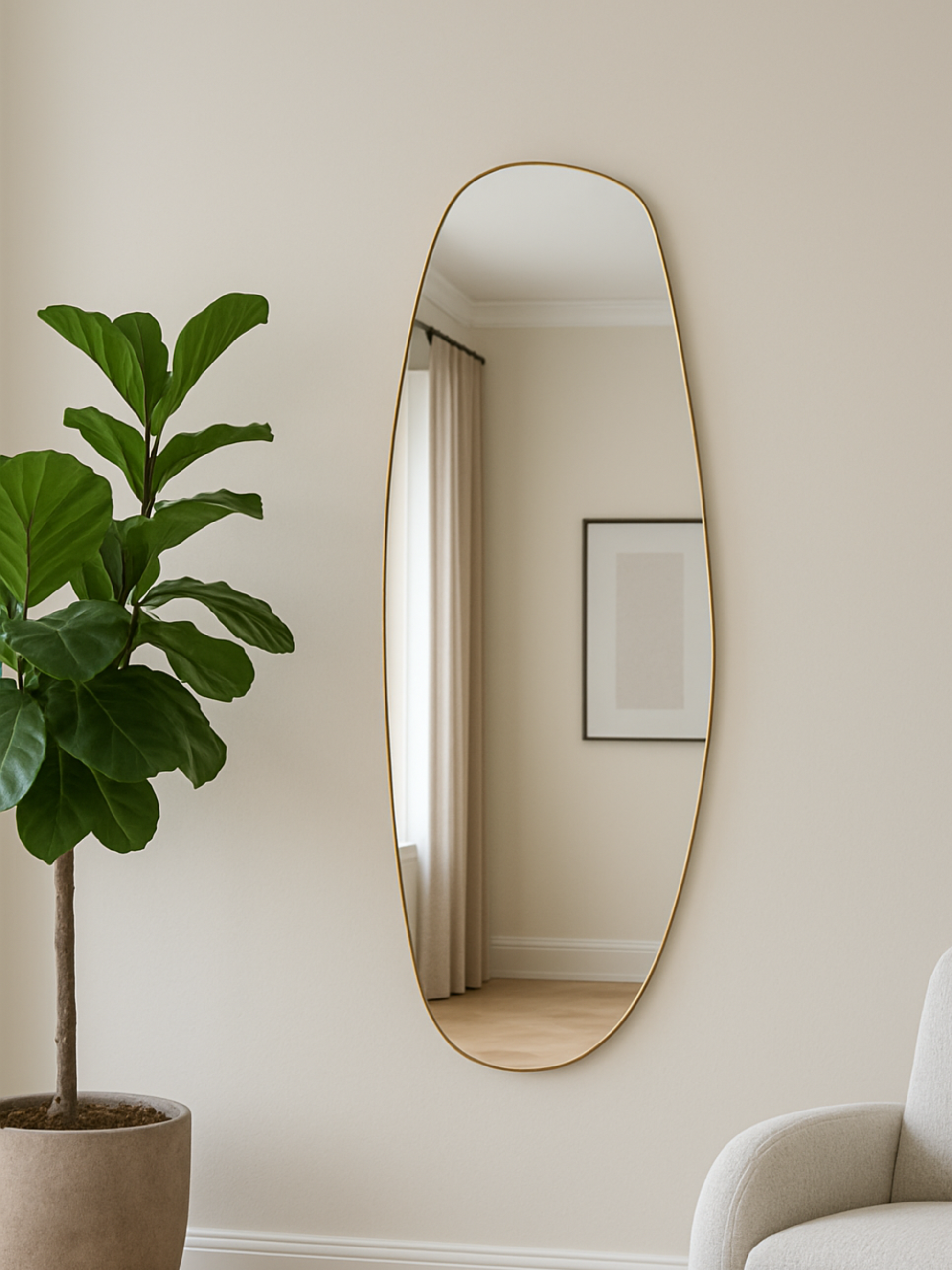 De asymmetrische, vloeiende lijnen zorgen voor een natuurlijke en speelse uitstraling. Deze spiegel is een echte blikvanger die balans en karakter toevoegt aan uw interieur.
