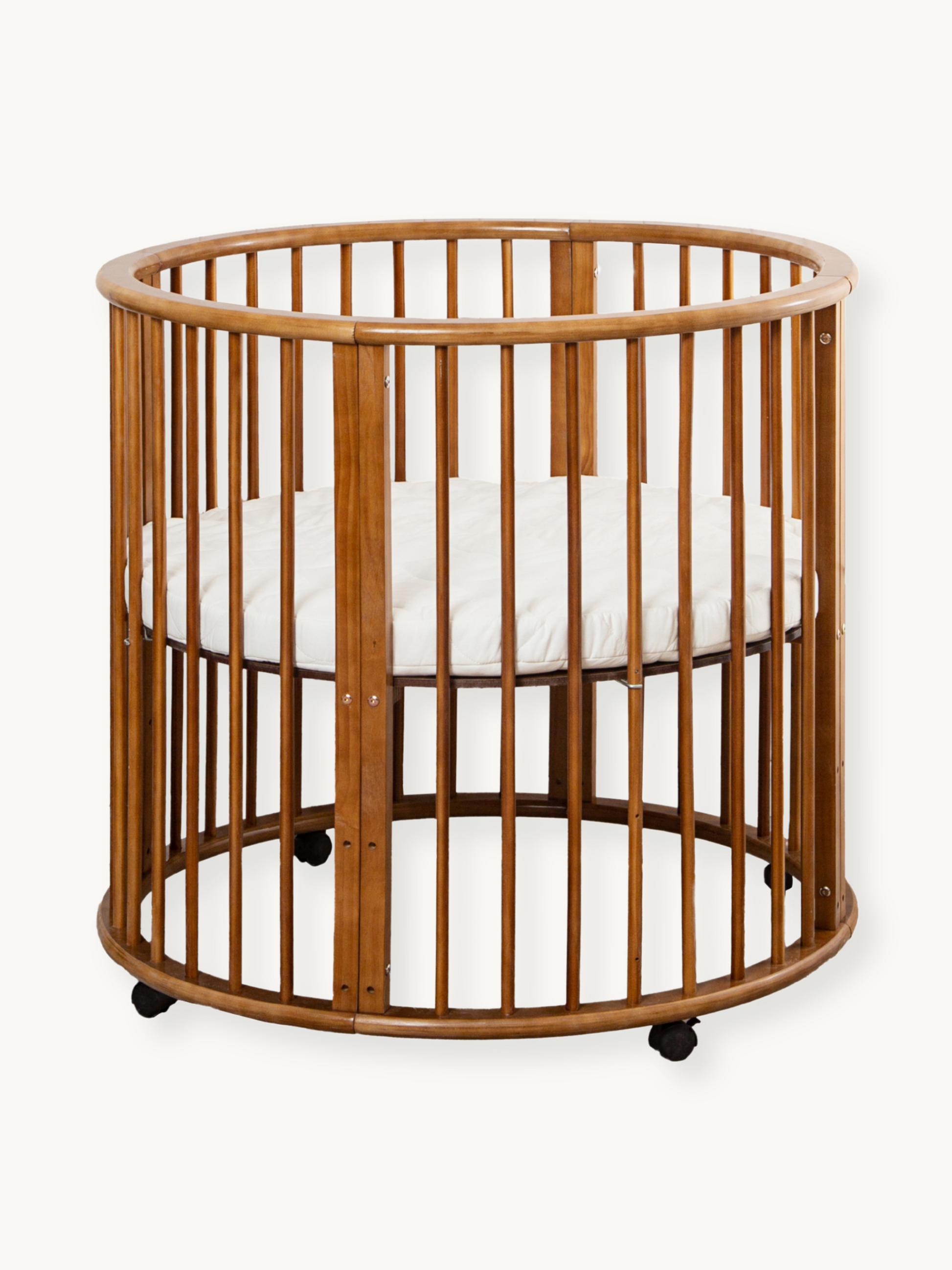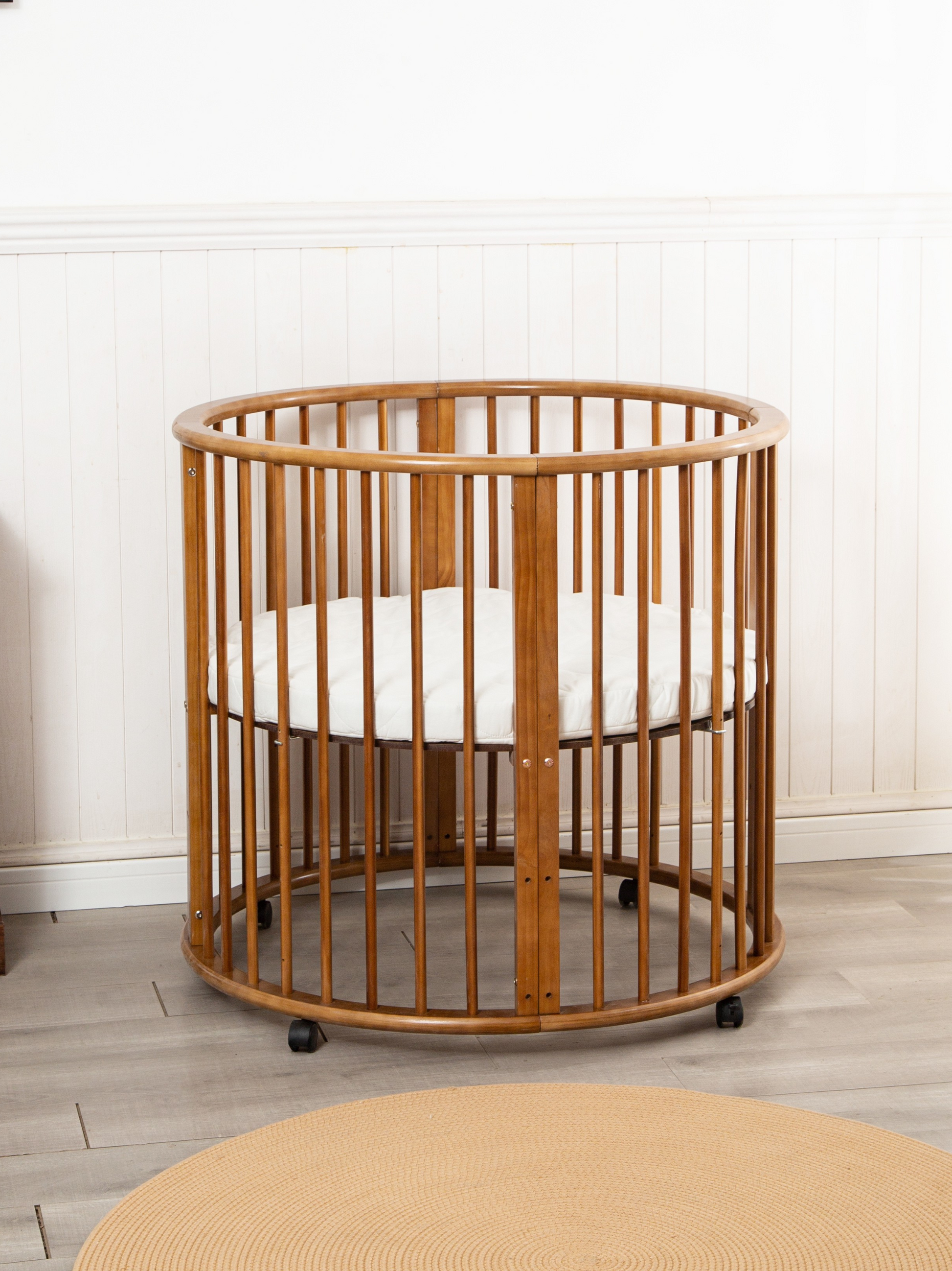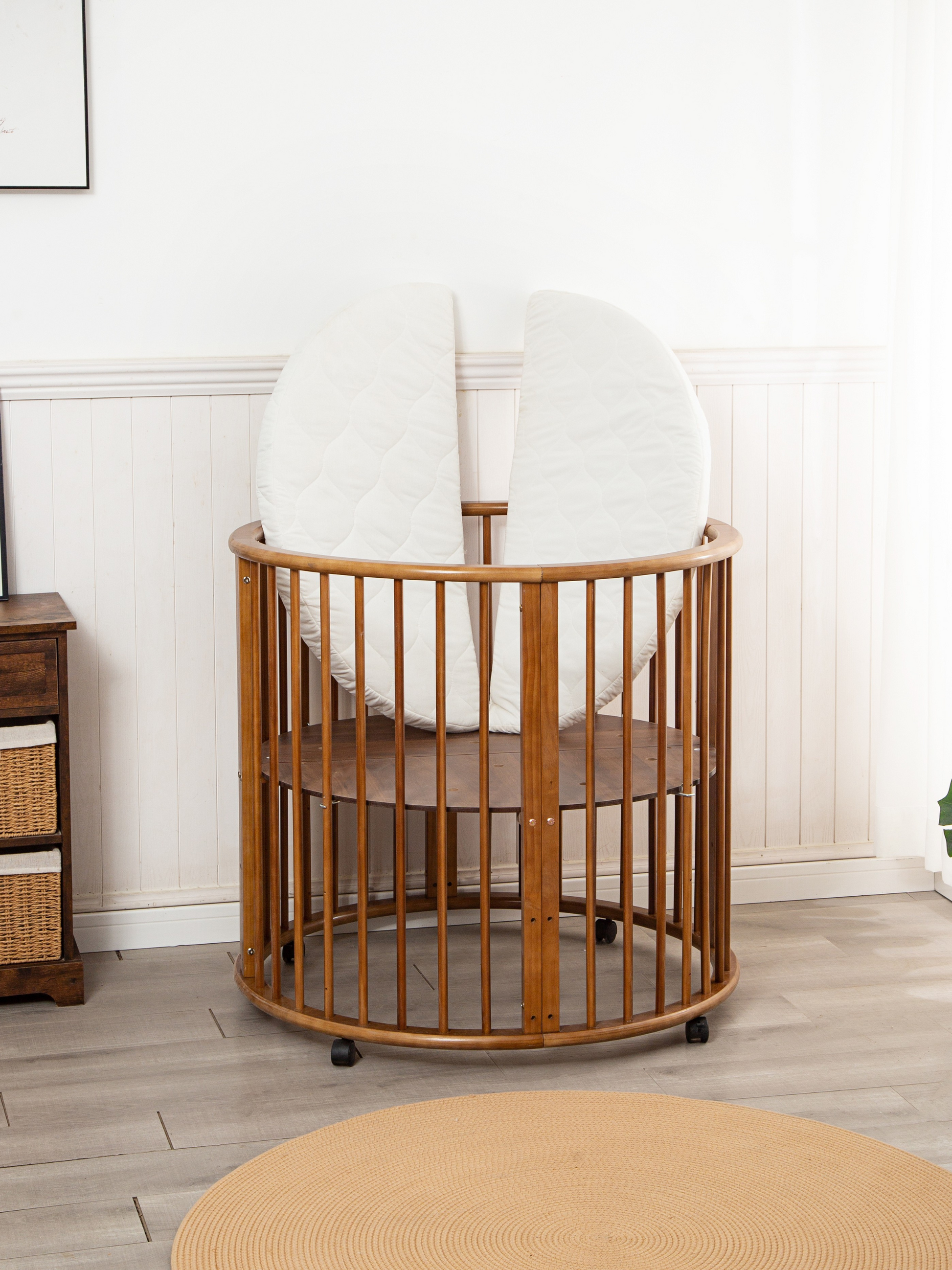 De unieke ronde vorm maakt deze babybox een echte blikvanger in elke ruimte. De bruine houten afwerking geeft hem een rustige en moderne uitstraling die past bij verschillende interieurstijlen.