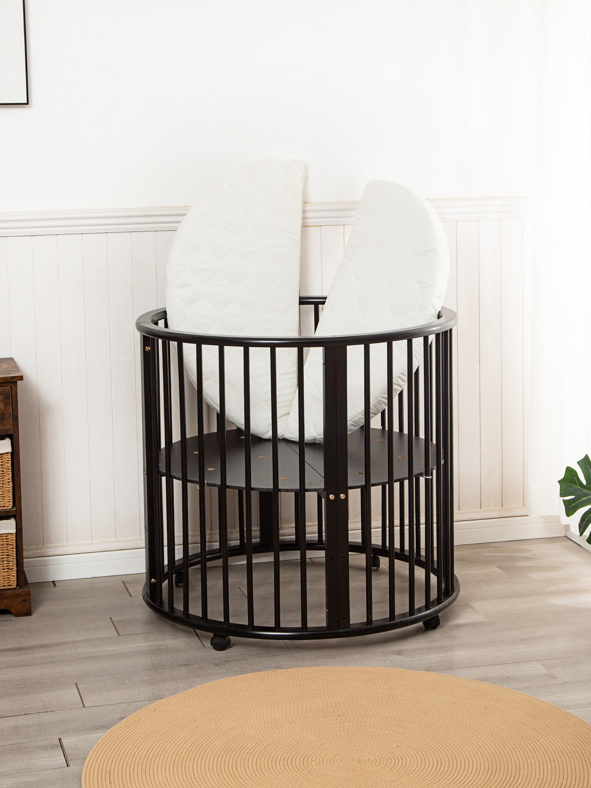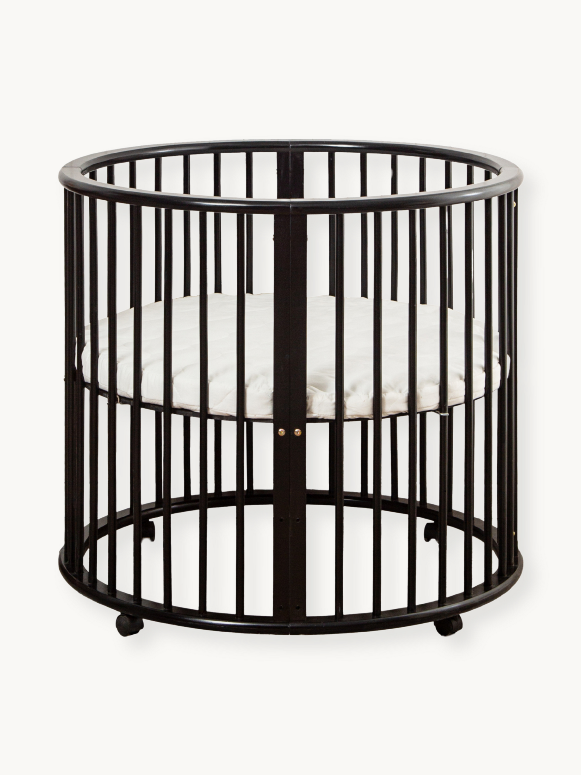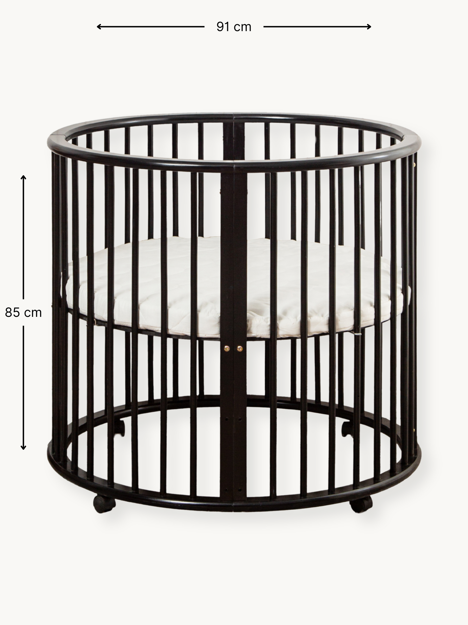 De unieke ronde vorm maakt deze babybox een echte blikvanger in elke ruimte. De zwarte houten afwerking geeft hem een rustige en moderne uitstraling die past bij verschillende interieurstijlen.