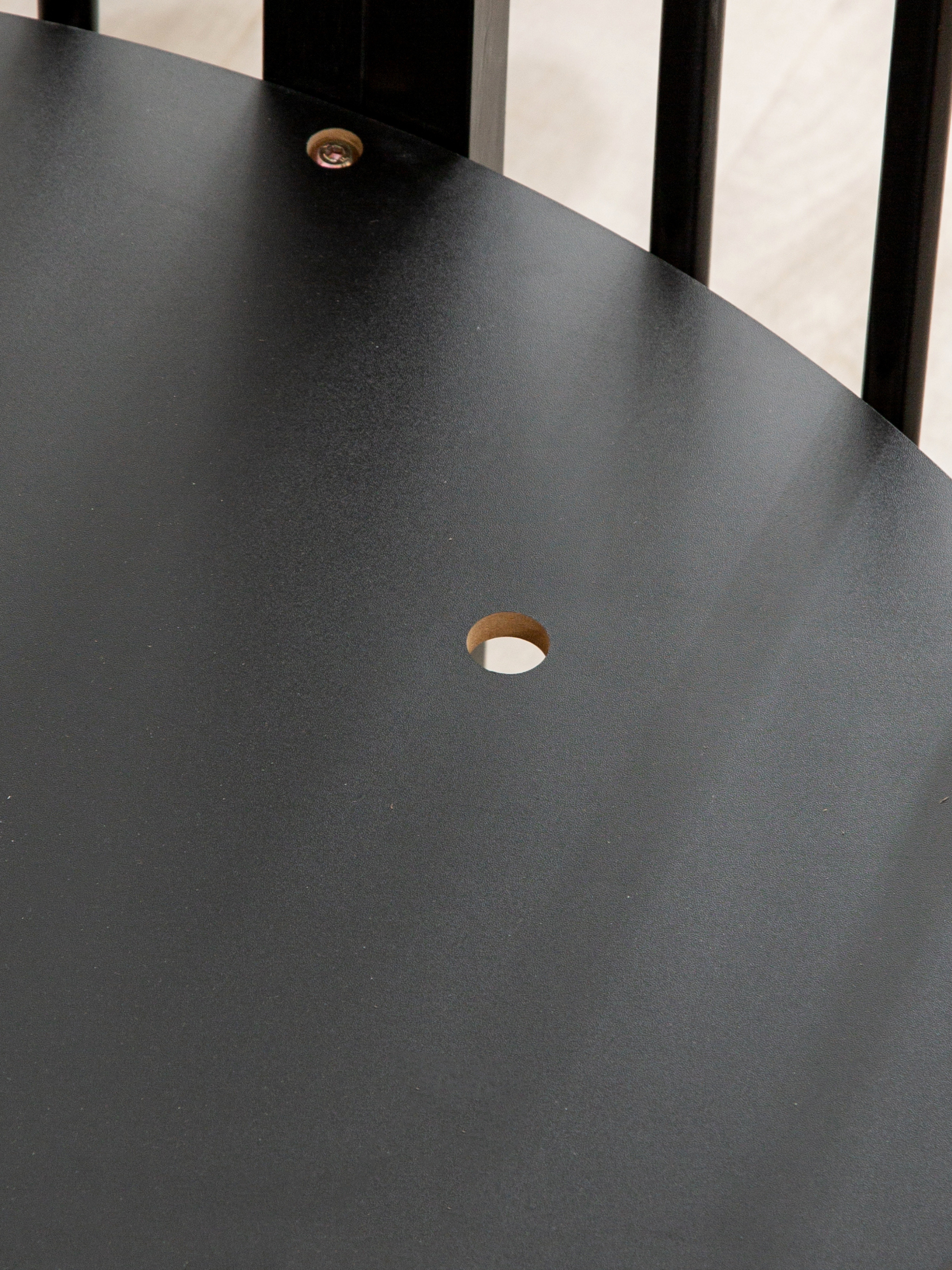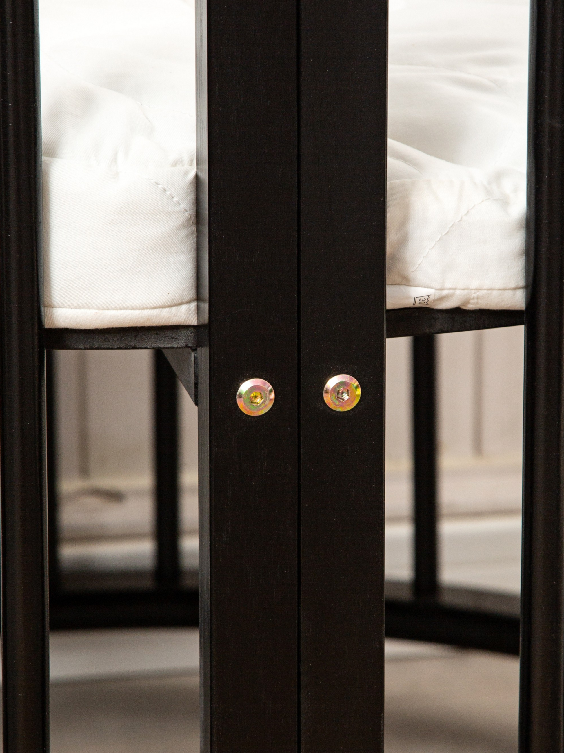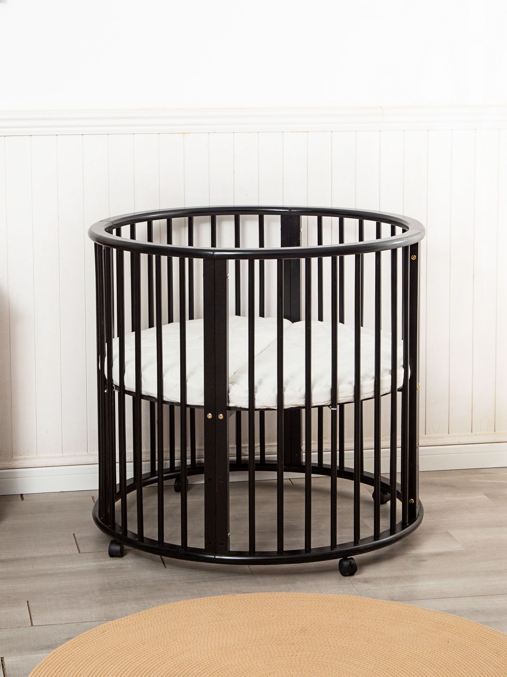 De unieke ronde vorm maakt deze babybox een echte blikvanger in elke ruimte. De zwarte houten afwerking geeft hem een rustige en moderne uitstraling die past bij verschillende interieurstijlen.